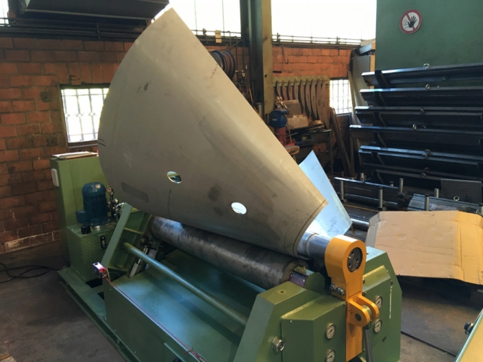Wir setzen uns zum Ziel, Konen und Rohrschüsse in allen Dimensionen und Werkstoffen herstellen zu können. Eine letzte kleine Lücke haben wir nun geschlossen. Es sind nun auch sehr kleine Bauteile möglich. Die neue Dreiwalzen-Rundbiegemaschine der Fa. Stölting wurde speziell für Mudersbach konstruiert und angefertigt. Die Walze verfügt über insgesamt drei austauschbare Oberwalzen (170 mm + 120 mm und eine Konuswalze mit 75 mm Durchmesser). Dies macht die Maschine sehr flexibel. Weiterhin bringt die Maschine mit einer sog. „Teach-Steuerung“ eine sehr hohe Wiederholgenauigkeit bzw. Reproduzierbarkeit der Bauteile mit sich. Die Walzen sind bis zu 100 mm schräg verfahrbar damit auch sehr spezielle Konusformen gebogen werden können.