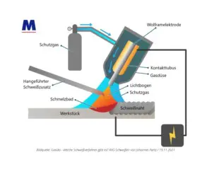 Beim WIG-Schweißen wird der Lichtbogen über eine nicht abschmelzende Wolframelektrode erzeugt. Der benötigte Schweißzusatz wird als Elektrode per Hand zugeführt, was das Schweißverfahren in der Ausführung sehr anspruchsvoll macht. Zur Abschirmung des Schmelzbades vor dem Umgebungssauerstoff werden inerte Schutzgase, wie Argon (Ar) oder Helium (He) eingesetzt.